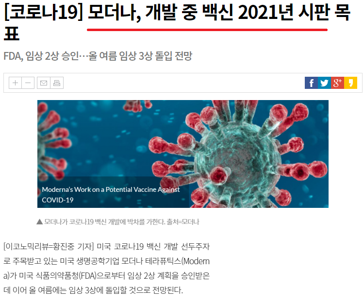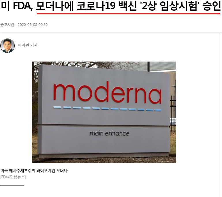 미국 바이오기업 모더나, 코로나 19 백식 2상 승인 올여름 3상 계획 5/8 뉴스발표