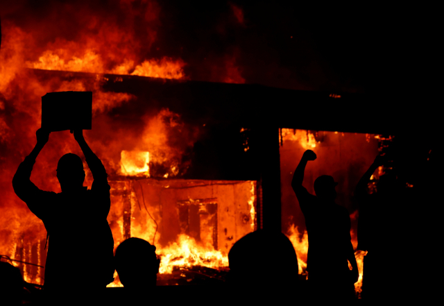 방화로 불타는 건물 앞의 성난 미니애폴리스 시위대. AP연합뉴스
