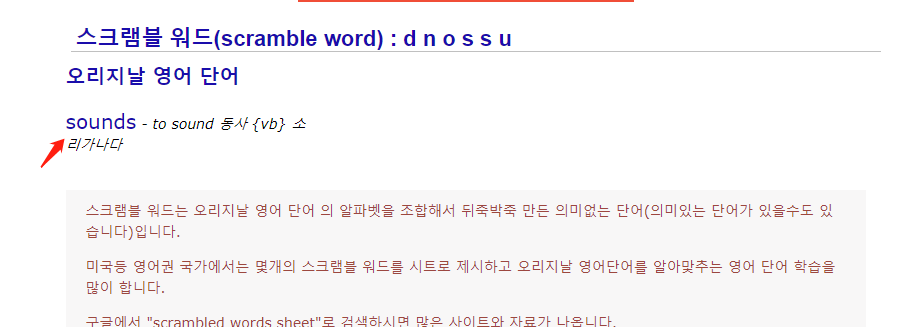 미국등 영어권 국가에서는 몇 개의 스크램블 워드를 시트로 제시하고 오리지널 영어단어를 알아맞히는 영어 단어 학습을 많이 합니다.