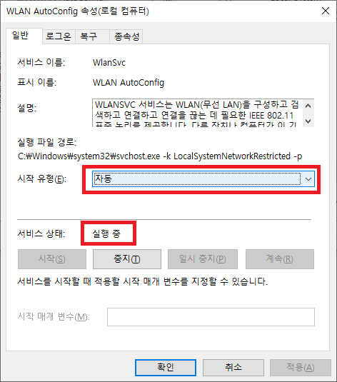 시작 유형이 자동인지, 아니라면 자동으로 변경합니다.