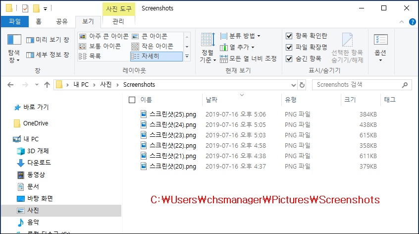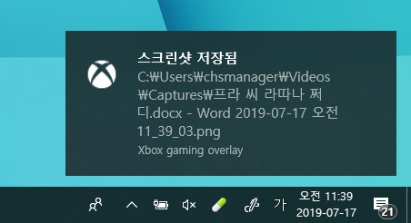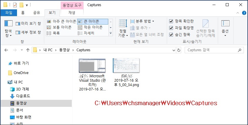스크린샷은 "C:\Users\[사용자이름]\Videos\Captures\"에 저장되는데