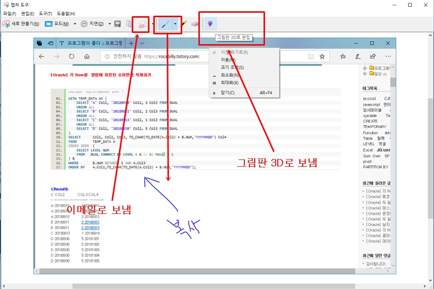스크린샷에 대해 주석을 달거나 그림판3D로 보내기 또는 이메일로 보낼 수 있는 편리한 기능도 제공합니다.