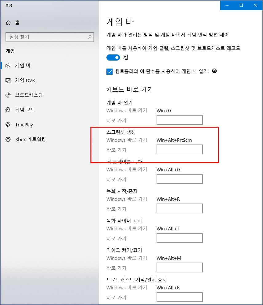 위에서 언급한 윈도우10 단축키 [ Window + ALT + Print Screen ]가 게임바 프로그램의 스크린샷 단축키 입니다.