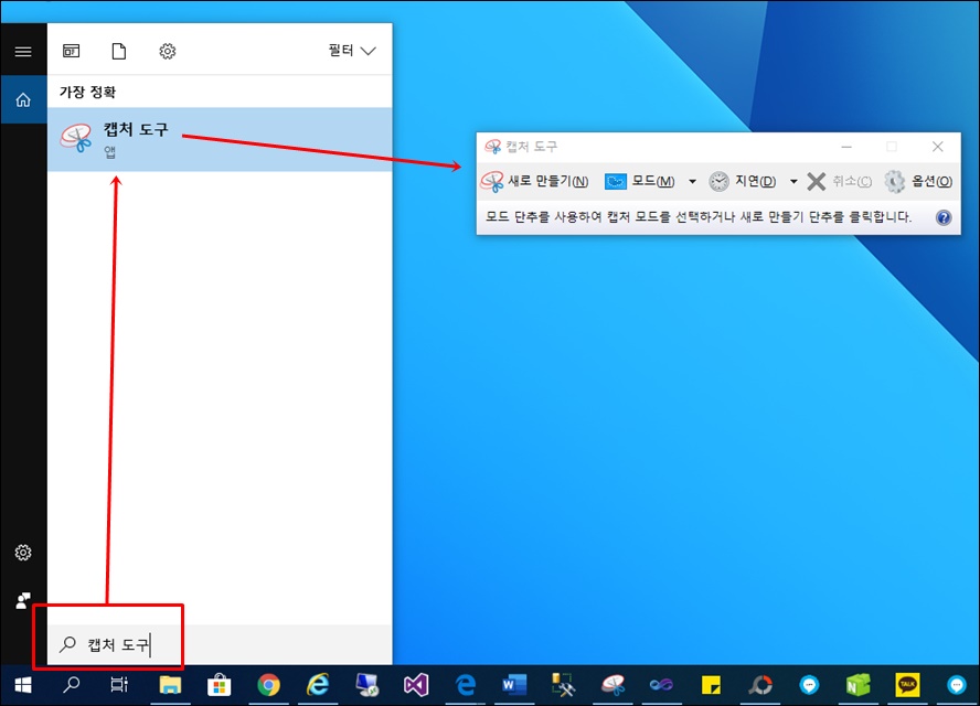 검색창에 "캡처 도구"를 입력하면 해당 프로그램을 실행할 수 있습니다.
