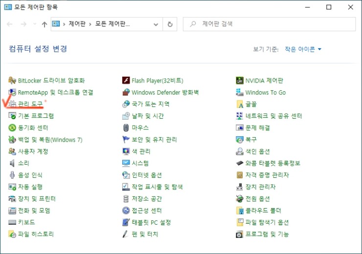 아래처럼 열리면 관리도구를 찾을 수 없어요. 우측상단 범주에서 작은 아이콘을 선택하세요.