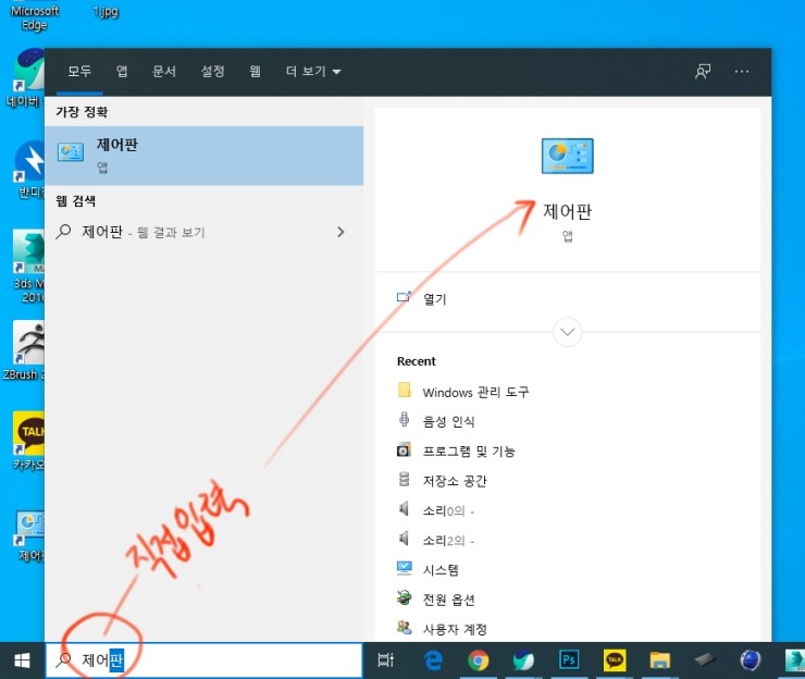 제어판이 안보이시면, 아래처럼 키워드로 찾으면 됩니다.