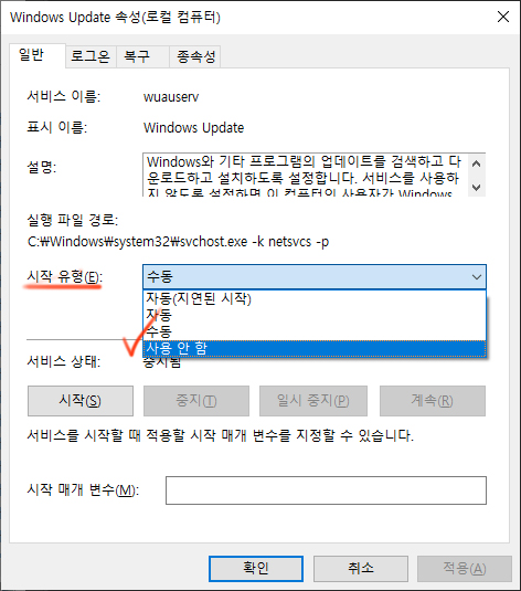 6. 화면처럼 일반탭에서 시작유형을 '사용안함'으로 바꾼뒤 하단 '적용'을 클릭하면 됩니다.