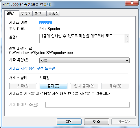 Print Spooler 속성 창이 열리면 중지버튼을 클릭하고