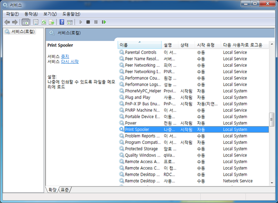 서비스 프로그램이 실행되면 Print Spooler을 열어서