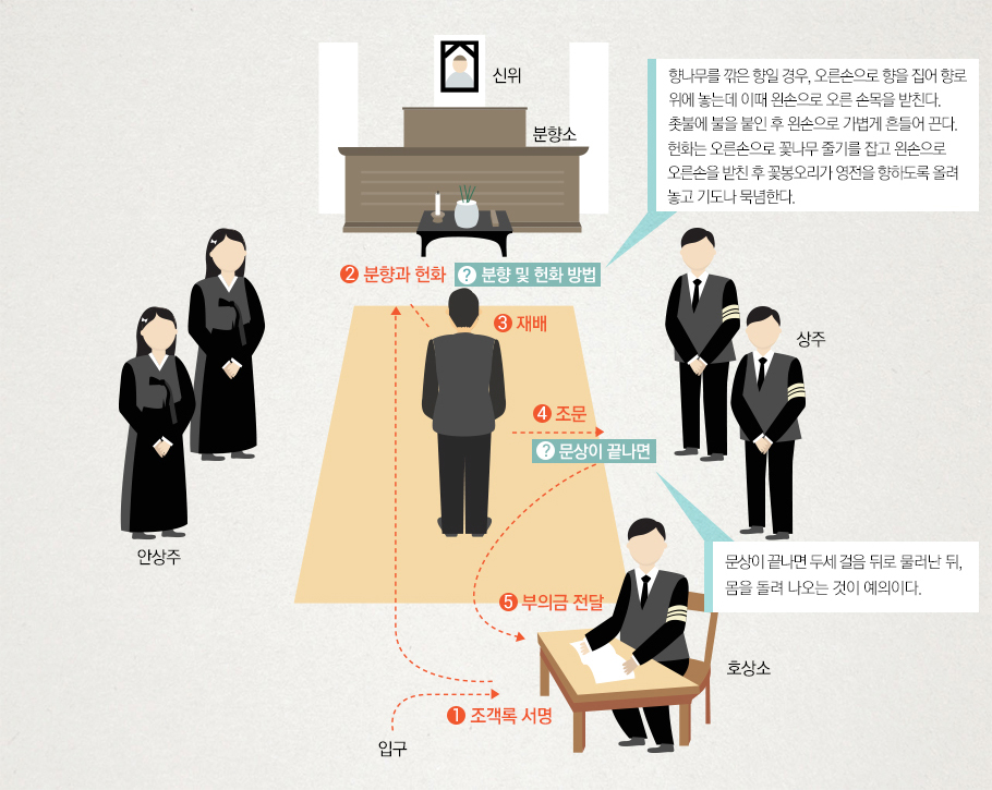 반가운 친구나 친지를 만나더라도 큰소리로 이름을 부르지 말고 낮은 목소리로 조심스럽게 말하며 조문이 끝난 뒤 밖에서 따로 이야기 하도록 해야한다.
