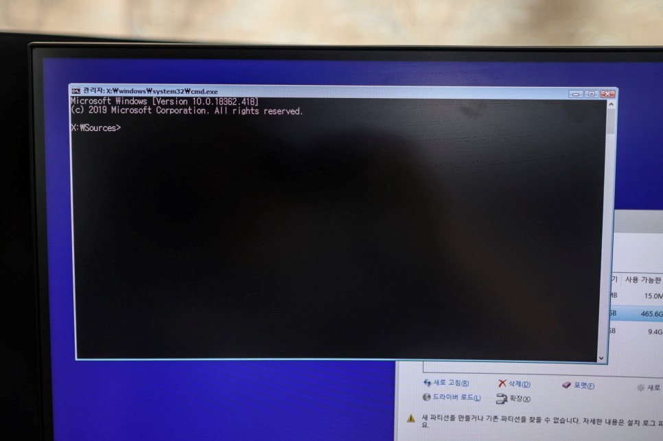 위와 같이 주 드라이브가 잡히지만 진행을 위해 설치를 할 경우 '새 파티션을 만들거나 기존 파티션을 찾을 수 없습니다. 자세한 내용은 설치 로그 파일을 참조하세요.'라는 친절한 안내 멘트? 가 뜹니다. 또는 선택한 디스크에 MBR 파티션 테이블이 있습니다 등등...
