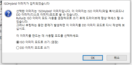 이런 경고창이 뜰텐데 ISO 이미지 모드로 쓰기(권장) 을 선택하고 OK를 눌러줍니다.
