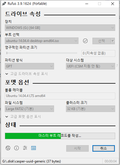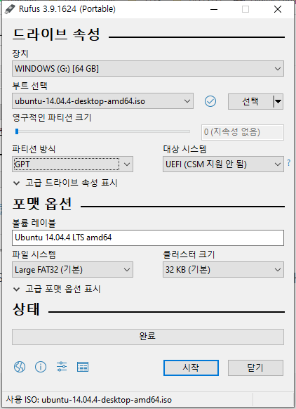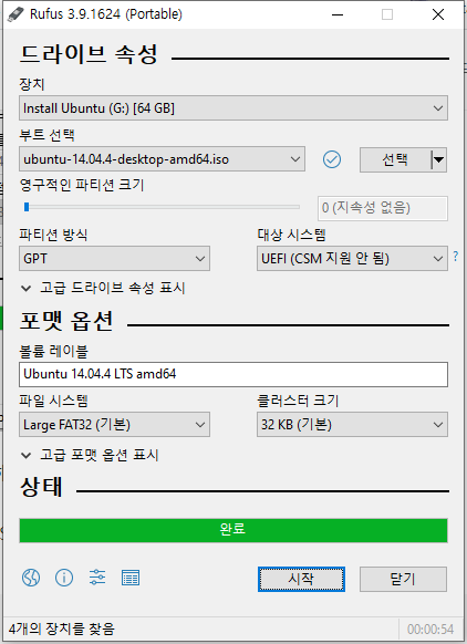 선택이 완료 되었다면 시작버튼을 눌러서 디스크를 만들어 줍니다.