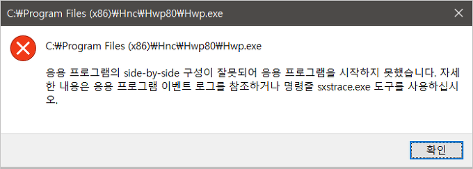 이번 포스팅에는 응용 프로그램을 실행할 때 '응용 프로그램의 side-by-side 구성이 잘못되어 응용 프로그램을 시작하지 못했습니다. 자세한 내용은 응용 프로그램 이벤트 로그를 참조하거나 명령줄 sxstrace.exe 도구를 사용하십시오.'라는 메시지가 뜨면서 진행이 되지 않는 오류의 해결 방법에 대해 정리해봤습니다.