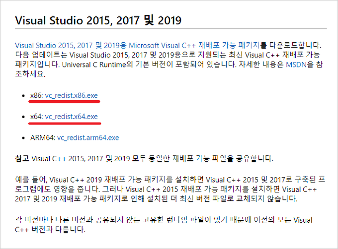 2. 열리는 페이지에서 Visual Studio 2015, 2017 및 2019 항목 아래에 있는 링크를 클릭하여 설치 파일을 다운로드 합니다. x86은 윈도우 32비트, x64는 윈도우 64비트 설치 파일입니다. 사용 중인 운영체제에 알맞은 것을 골라 받아주세요.