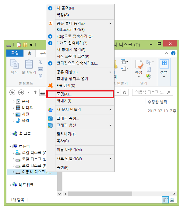 2. 윈도우 탐색기(단축키: 윈도우 로고키+E)를 열고 USB(이동식 디스크)에 대고 마우스 오른쪽 버튼을 클릭하면 열리는 메뉴에서 [포맷]을 선택해주세요.