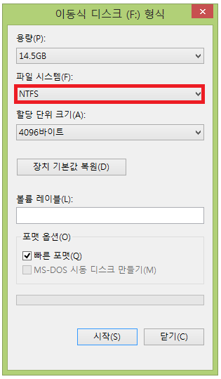파일 시스템을 아래와 같이 [NTFS]로 선택한 다음, [시작]을 눌러 포맷을 진행합니다. 포맷이 완료된 후 복사가 되지 않던 파일의 복사를 다시 진행해보면, "파일이 너무 커서 대상 파일 시스템에서 사용할 수 없습니다." 오류 메시지 없이 정상적으로 복사가 되는 것을 확인할 수 있다.