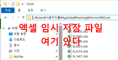 파일탐색기를 열어서, 숨겨진 파일을 볼 수 있게 옵션을 수정한 뒤, 저 위치를 찾아가보면 임시파일들이 있습니다.