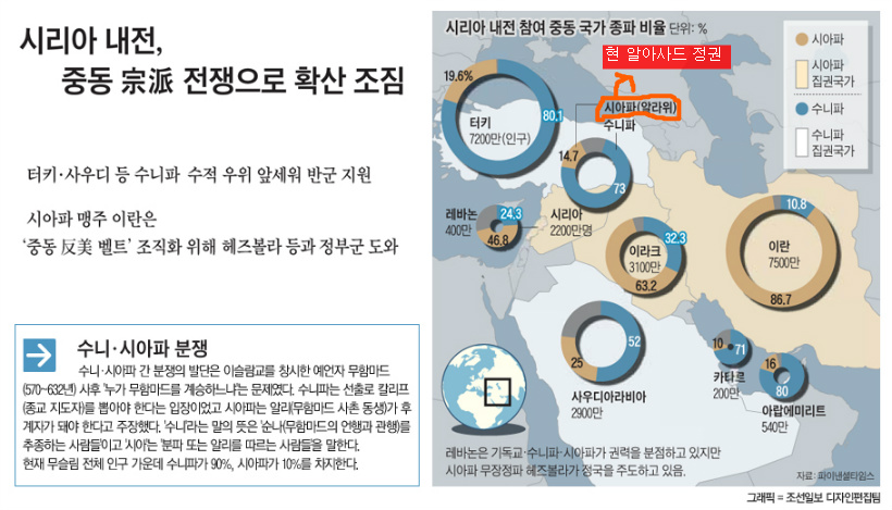이렇게 러시아와 이란은 시아파인 알아사드 정부를 지원하고 미국, 프랑스 등 서방국은 수니파인 반군을 지원한다.