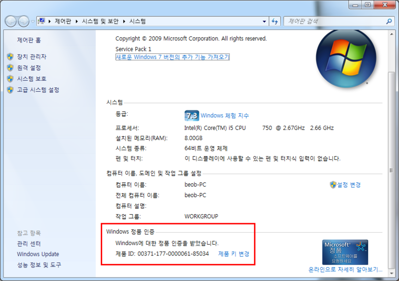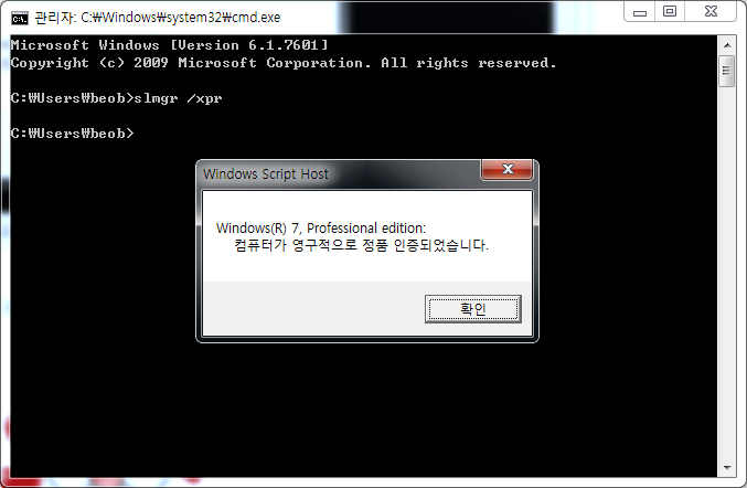 "Windows7 Professional 버전이 영구적으로 정품 인증되었다는 확인 메세지를 받을 수 있습니다.