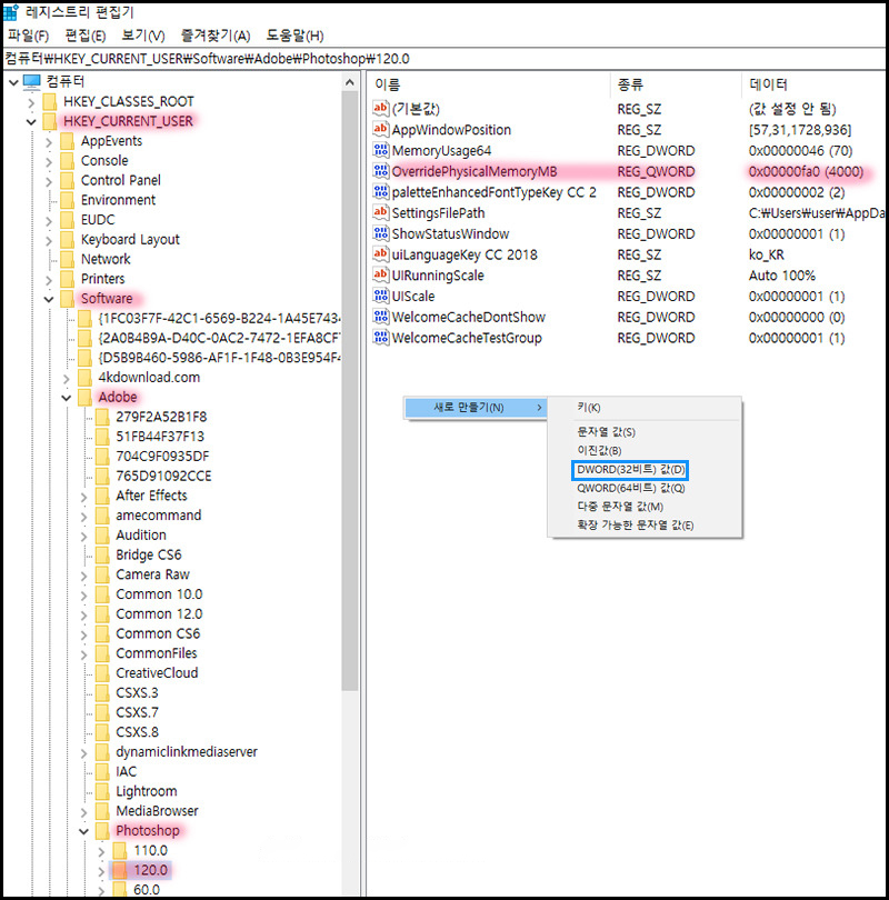 새로만들기>DWORD(32비트) 값을 클릭합니다.