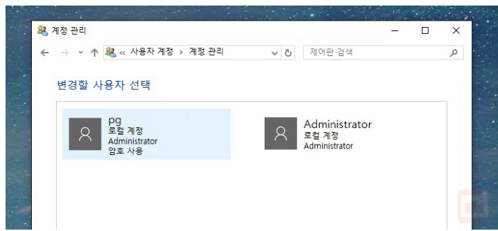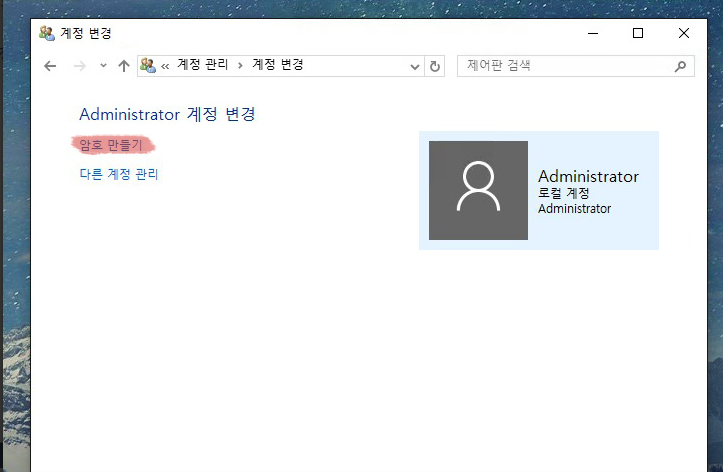 제어판 – 사용자 계정 – 계정 관리에서 administrator 계정이 활성화된 것을 확인할수 있습니다.