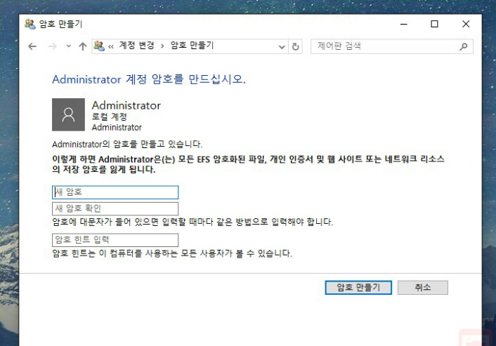 새로 생성된 administrator는 기본적으로 암호가 설정되어 있지 않기 때문에 원격 접속을 기반으로 사용하는 경우 암호 설정이 되어 있지 않아 로그인을 못하는 경우가 생기므로 암호를 설정합니다.