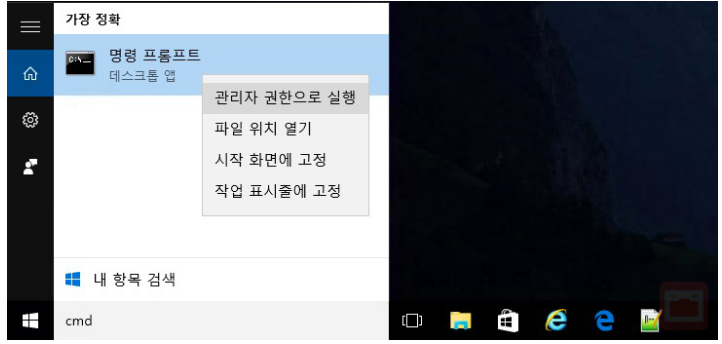 윈도우 10 같은 경우 검색 상자에 cmd 를 검색후 명령 프롬프트를 우클릭해 ‘관리자 권한으로 실행’ 할수도 있습니다.