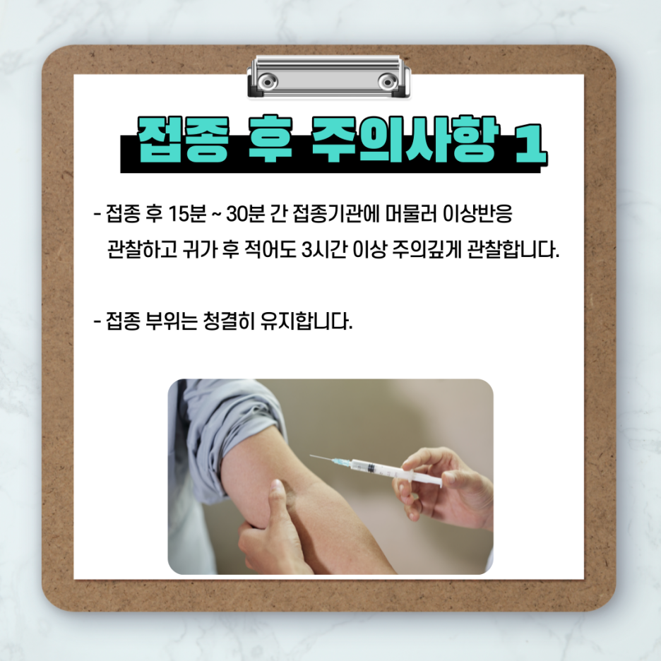 - 접종 후 15분 ~ 30분 간 접종기관에 머물러 이상반응