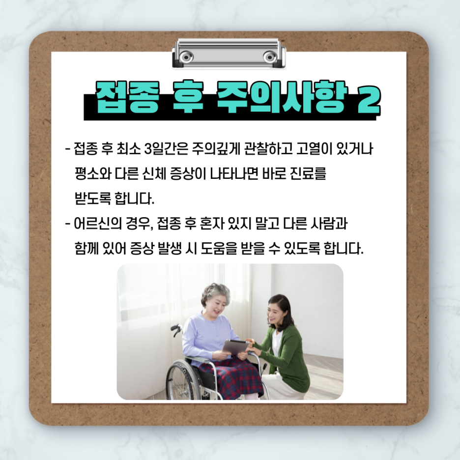 - 어르신의 경우, 접종 후 혼자 있지 말고 다른 사람과