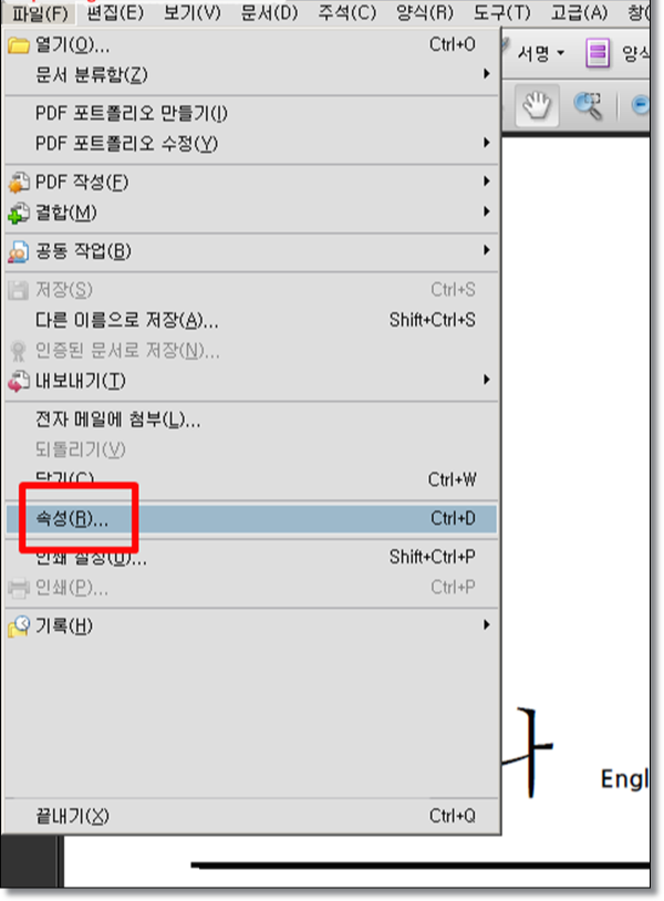 먼저 설치된 Adobe Acrobat으로 보안걸린 PDF파일을 열어 파일 -> 속성으로 들어갑니다