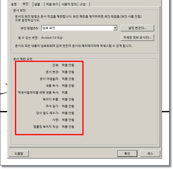 상단에 보안 탭을 클릭하시면 문서 제한 요약을 보시면 보안이 걸린것을 알 수가 있는데요