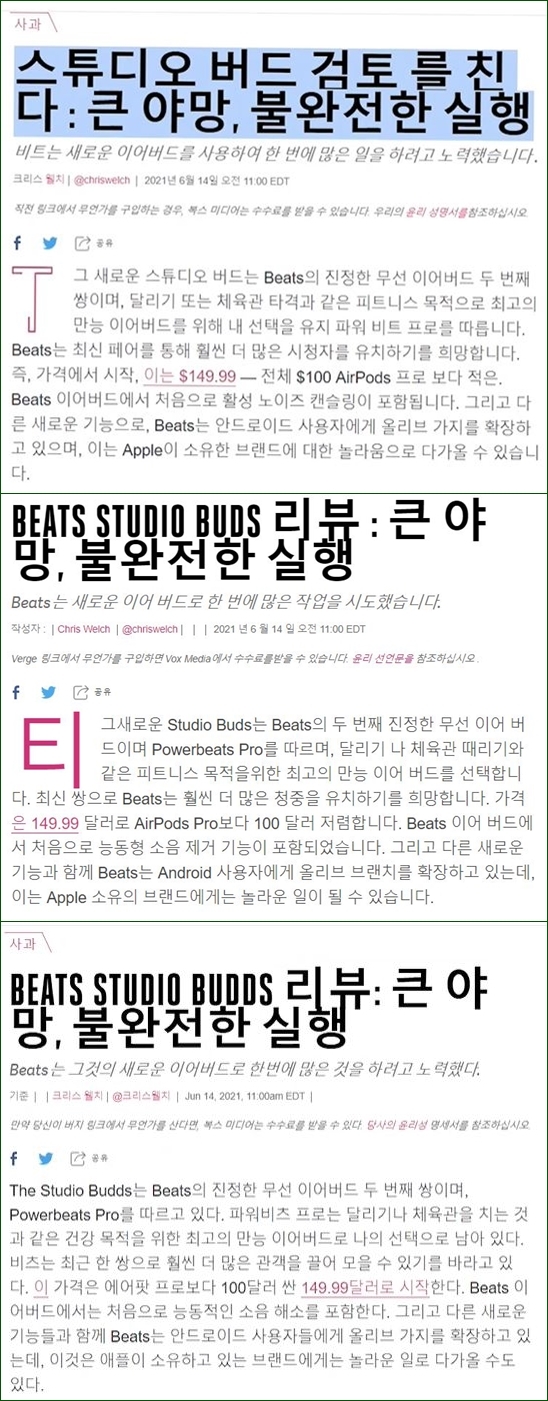 상단부터 엣지, 크롬, 웨일 순으로 번역을 돌린 모습.