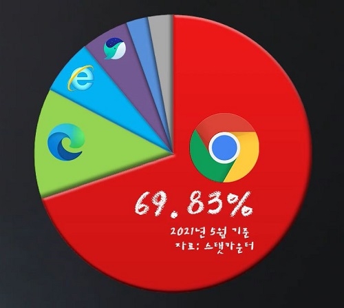 지금의 브라우저 시장은 마치 중국 고대 ‘춘추전국시대’와 같습니다. 점유율 기준으로 크롬이 70%에 육박해 크긴 하지만, 아직 과거 익스플로러만큼의 절대적 지배력은 없죠. 엣지가 12.83%, 네이버 웨일이 5.54%로 조금씩 입지를 키우고 있습니다.