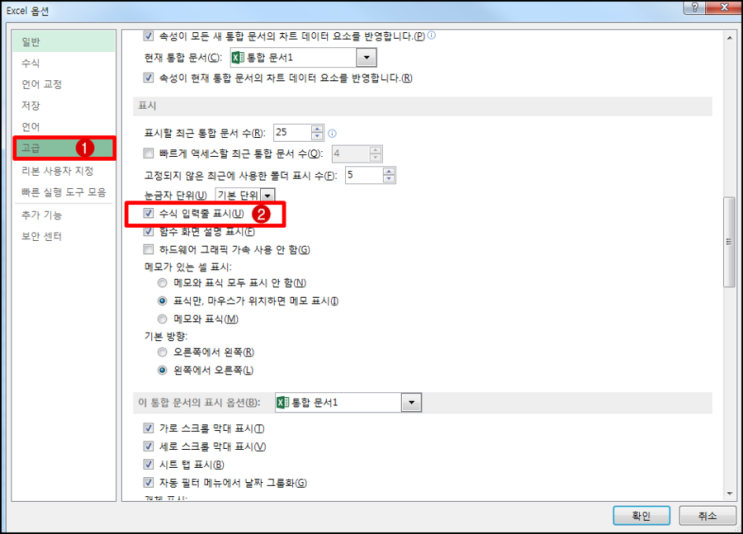 [오피스단추]-[옵션]-[고급]-[표시]-[수식 입력줄] 표시 체크