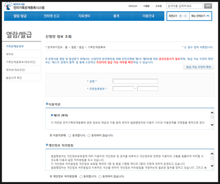 주민등록번호 혹은 부 또는 모의 성명과 등록기준지를 입력 후 가족관계증명서 발급