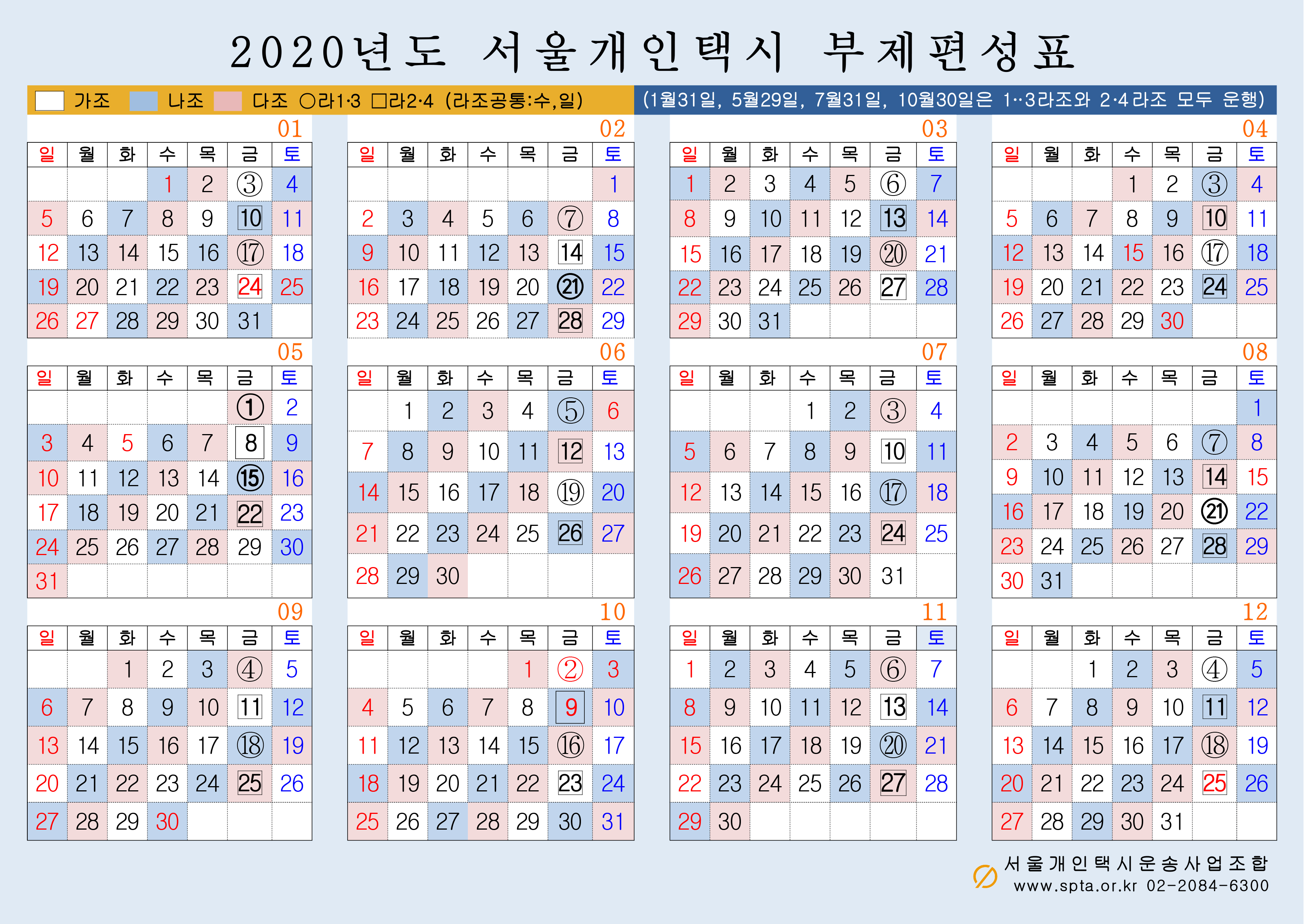아래는 서울개인택시운송사업조합에 게재된 2020년도 서울개인택시 부제편성표 입니다.