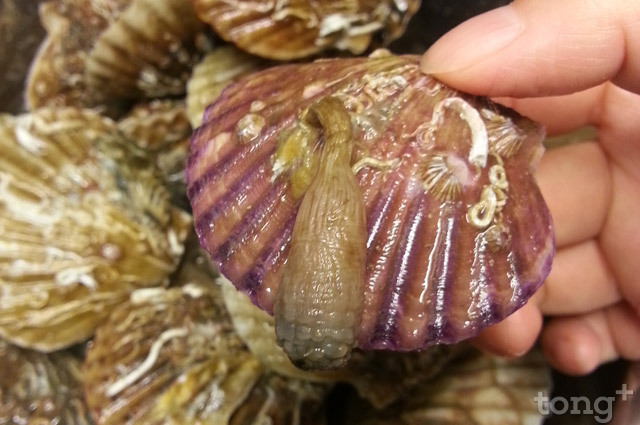 가리비에 붙어 있는 미더덕(껍질 벗기기 전)