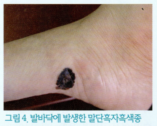 말단흑자흑색종은 손발바닥, 손발톱에 잘 발생하는 흑색종으로 주로 검은색의 불규칙한 반점이 점차 커지면서 헐거나 피가 나기도 합니다.