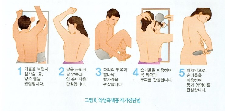 또한 재발의 발견과 새로운 흑색종의 조기발견을 위해 환자 자신에 의한 ‘자가진단’이 권장됩니다. 그 방법은 우선 전신이 비치는 큰 거울, 작은 손거울과 머리카락을 젖히기 위한 연필 등을 준비한 다음 손발 바닥, 손발톱, 두피와 등을 포함한 전신의 피부를 빠짐없이 매우 세밀히 관찰하는 것입니다.