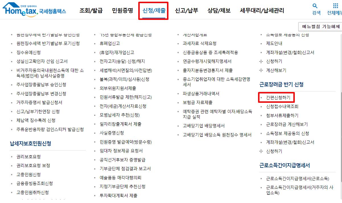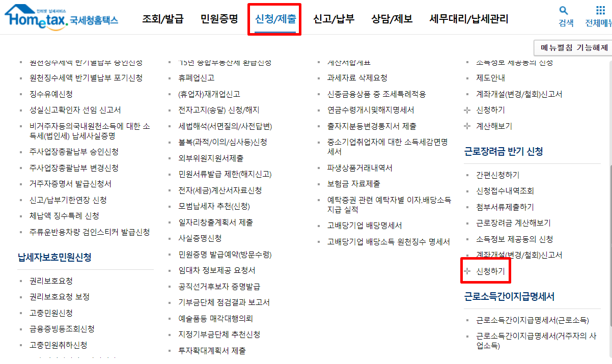 국세청 홈택스 홈페이지에 접속하여 페이지 상단 '신청/제출' 탭에서 '근로장려금 신청' 항목을 선택합니다. 신청안내문을 받지 못한 경우 '간편신청'이 아닌 '신청하기'를 클릭합니다.