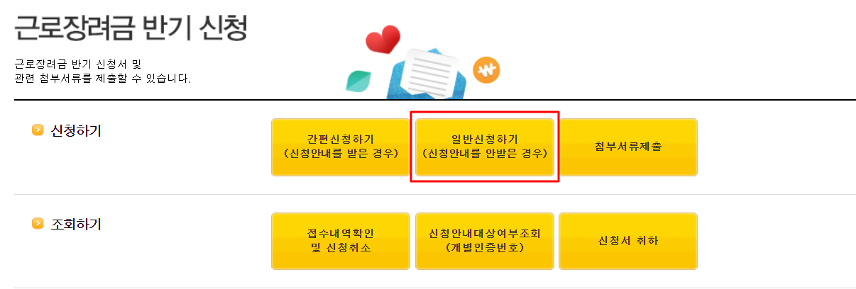 근로소득자는 정기 지급방식과 반기 지급방식 가운데 한가지를 선택하여 신청하면 되는데요. 다만, 사업소득자와 종교인의 경우 반기신청은 불가능하며 정기신청만 가능합니다. 근로장려금 신청방법은 신청안내문을 받은 경우와 받지 못한 경우에 따라 차이가 있는데요.