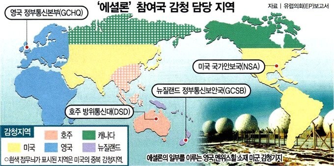 그냥 일반적인 동맹과 무엇이 다른지 모르겠다고요? 파이브 아이즈는 각국의 공식적인 법과 규제에 응하지 않는 일종의 초법적인 첩보 체제입니다. 이들은 단순히 정보만 공유하는게 아니며 서로 공조해 전 세계의 통신을 감시. 감청하는 에셜론을 함께 운영합니다. (물론 자국 법을 적용하면 엄연한 불법입니다)