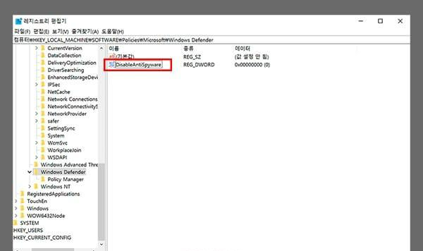 - “DisableAntiSpyware“를 두 번 클릭합니다.