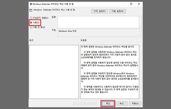 8. 새 창이 열립니다. 왼쪽의 “사용” 옵션을 적용한 다음 “확인“을 클릭 해주세요.
