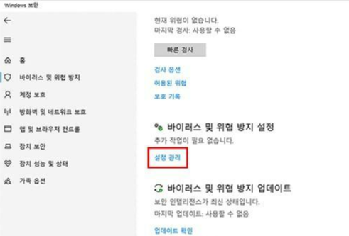 6. 바이러스 및 위협 방지 창이 열립니다. 바이러스 및 위협 방지 설정에서 ‘설정 관리‘를 클릭하세요.