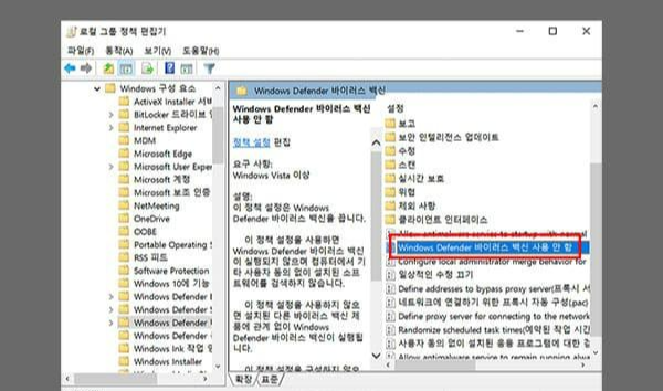 7. 오른쪽에서 “Windows Defender 바이러스 백신 사용 안 함“을 두 번 클릭합니다.