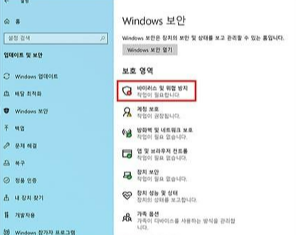 5. 보안 영역에서 ‘바이러스 및 위협 방지‘를 클릭합니다.