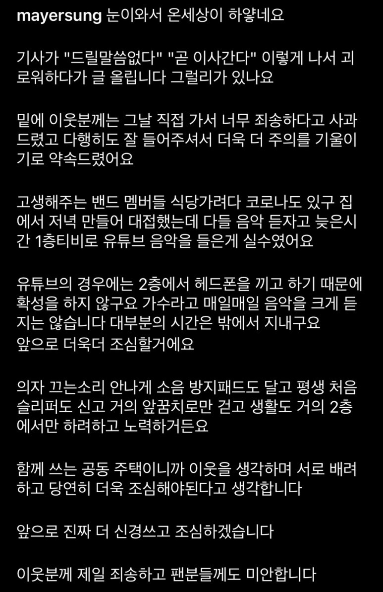 하지만 이는 오래 가지 못했고, "인터폰도 고장나서 관리실에 클레임을 해야 한다. 밤에는 경비원 분이 안계실 때가 많고 계시더라도 매번 죄송스러워서 도저히 못 참을 땐 천장을 몇 번 두들겼다. 한동안은 효과가 있었다"고 털어놓았습니다.