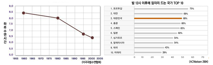 미국구립수면협회의 조사 결과에 따르면 현대인들의 밤 중 활동이 늘어나면서 수면시간이 지속적으로 줄고 있고, 전 세계적으로 밤 12시 이후에 잠자리에 드는 국가 Top 10 중 대한민국이 3번째로 꼽히며 전반적으로 늦게 잠자리에 드는 것으로 나타났습니다.